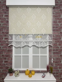 Çiftli Stor - Beyaz Damaks Desenli Tül Stor Krem Mat Lüks Stor